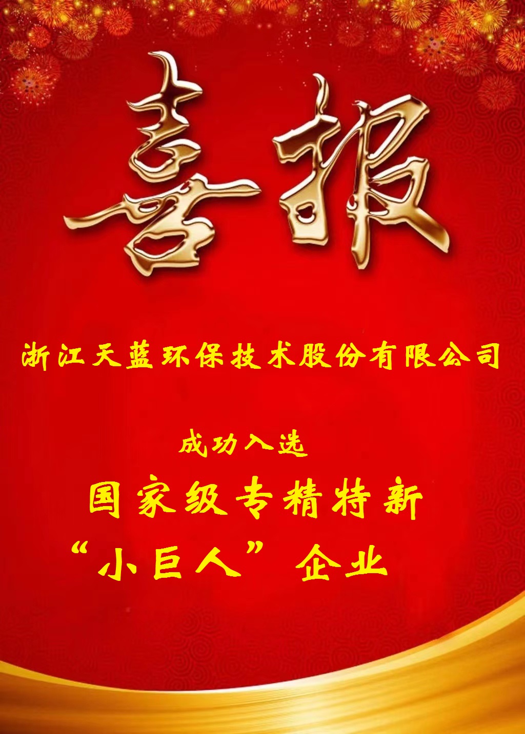 近日,浙江省經(jīng)濟和信息化廳發(fā)布了《關于浙江省第四批專精特新“小巨人”企業(yè)和第一批專精特新“小巨人”復核通過企業(yè)名單的公示》,天藍環(huán)保憑借在大氣污染治理領域的技術創(chuàng)新綜合實力和市場占有率,成功入選國家級專精特新“小巨人”企業(yè)名單。
